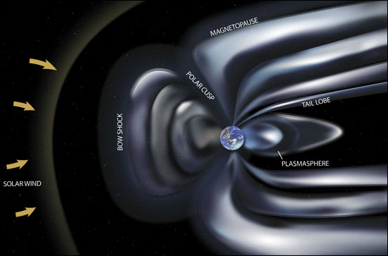 Particles from the Sun are deflected around the magnetic field |