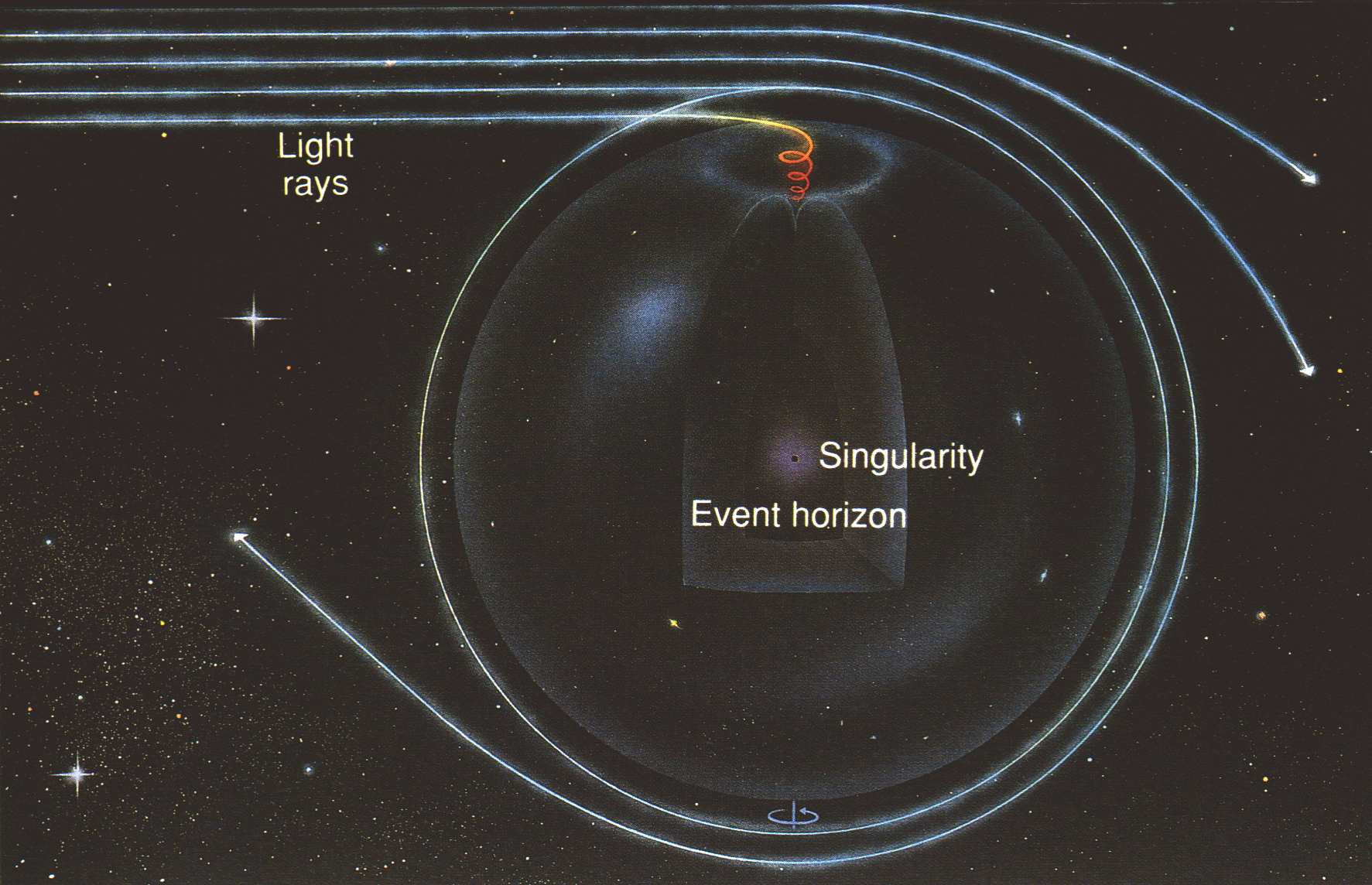 Neutron stars may seem very bizarre, but theory predicts an even odder type of 'star corpse', a Black Hole. If the collapsing core of a supernova is too massive (heavier than three suns), it cannot end up as a neutron star. Its own gravity is so powerful that the core continues to shrink, until it becomes a mathematical point, with no size at all and an infinite density. Surrounding this point is a region a few kilometres across where gravity is so strong that nothing can escape, not even light. This region is a black hole. It is 'black' because even light cannot escape; and even if you tried to illuminate it, the hole would swallow up the beam from your torch. It is a 'hole' because anything you throw into it can never emerge again, however powerful the rocket engines you might strap to it. The edge of the area of space around a Black Hole where its influence is felt, is known as the Event Horizon. This is in effect the point of no return. Anything crossing the event horizon will be drawn into the Black Hole and never be able to go back. Even light crossing this boundary cannot escape the pull of intense gravity of the Black Hole.