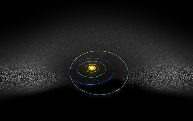 Comets can be divided into short-period and long-period orbits. Short-period comets have periods of less than 200 years, whereas long-period comets can take up to a million years to complete just one orbit of the Sun. This implies that long-period and short-period comets have a different source. Current thinking is that short-period comets reside in a belt, the Kuiper Belt, located between 4000 million and 7000 million kilometres from the Sun. Long-period comets are proposed to come from the Oort Cloud, at a distance of 3 million million kilometres. This distance is more inter-stellar than planetary.