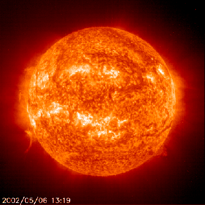 The Sun is about a million kilometres in diameter and contains nearly all the material of the solar system. It is hard to imagine but the Sun, like all the other stars, is a cloud of gas. The gravity of the cloud has compacted the cloud into the smallest volume possible, a sphere. A question which must be considered is ' what stops the Sun from collapsing even more under the enormous forces of its own gravity.' As a result of the incredible pressure at the centre of the Sun the temperature rises to millions of degrees centigrade. At this temperature and pressure a nuclear fusion reaction is generated (i.e. four hydrogen atoms are combined into one helium atom, and a large amount of energy is released). This energy creates an outward pressure at the centre of the Sun which pushes out against the force of gravity pushing in. The energy is transported by radiation in the inner 70% and by convection in the outer 30% of the Sun. On the surface the convection can be seen as granulation, which resembles bubbles. Moving currents and the rotation of the Sun form a complex magnetic field, whose strength varies and poles change in 11-year cycles. Where the lines of magnetism break through the surface, Sun Spots form.