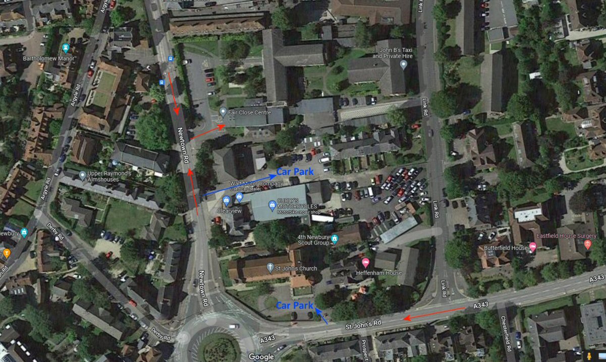Map 1 showing the roads in Newbury arrowed to Fair Close Centre