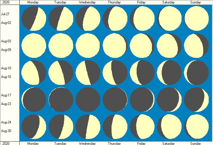 VENUS will be observable in the east before sunrise. It rises over the eastern horizon at 02:00 so will be observable from 03:00 until sunrise. Venus will appear ‘half Moon' shaped as it will be at greatest western elongation (at its furthest apparent distance from the Sun) on 14th August. On the 15 th August the ‘old' crescent Moon will be close to Venus and will make a good photo opportunity. The phase of the Moon on 15 th August is shown on the Lunar Chart opposite.