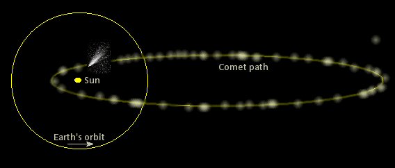 Dust particles released by the melt are heavier and therefore continue more or less on the same orbit. Some comets return in periods of tens or hundreds of years so particles become spread out along the orbital path and may eventually form a complete ring around the orbit.