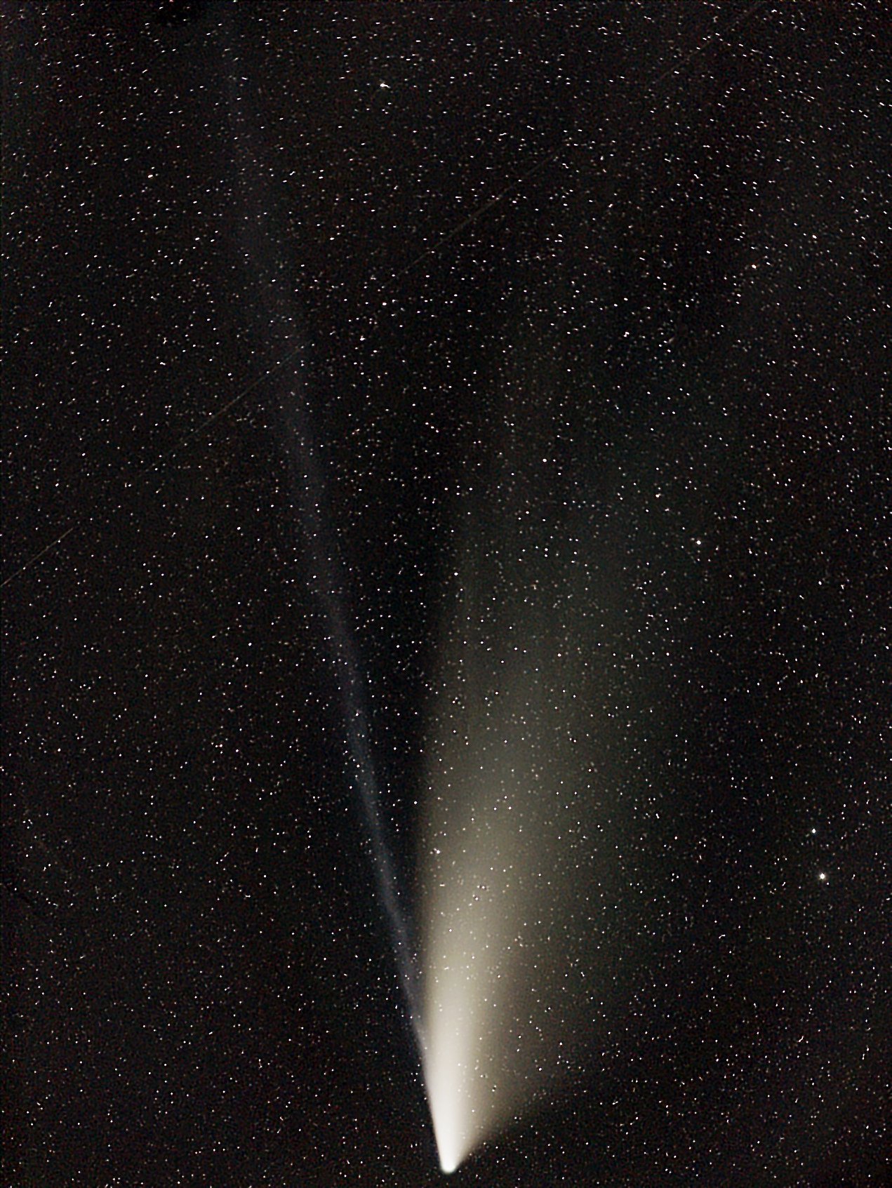 The image below was taken by Steve Knight at 23.50 on 20th July. Two tails can be seen on the image. The brighter curved tail on right is dust tail and the one on left is the blue ion tail.