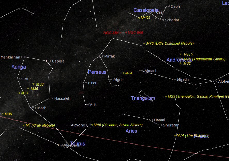 The constellation of Perseus is also host to one of the best annual meteor showers which is called the Perseid Meteor Shower. The meteor shower is named after Perseus because the meteors of this shower appear to radiate out from a point located in Perseus. This Radiant is actually located very close to the point on the chart above marking the two NGC objects NGC884 and NGC869. So the Radiant has been omitted from this chart but can be seen in detail in the article about the Perseid Meteor shower below.