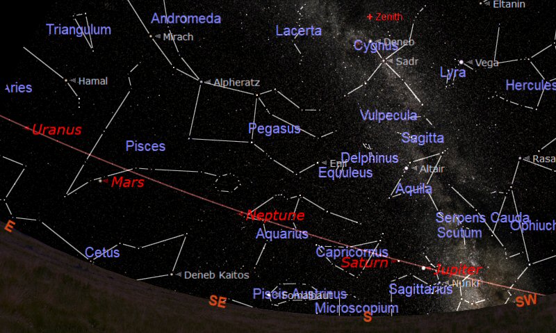 Planets observable: Jupiter, Saturn, Neptune, Mars, Uranus (in the evening) and Venus (in the early morning).