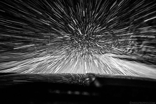As Earth is travelling at about 100,000 km/h around the Sun the meteors appear to radiate from a point in the direction we are travelling. This is rather like driving a car into a snow storm as shown below where the flakes appear to radiate from a point directly ahead.