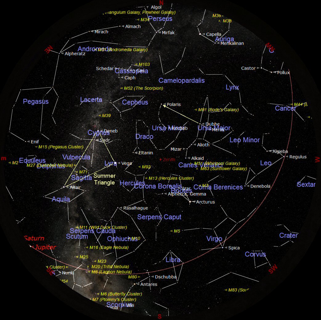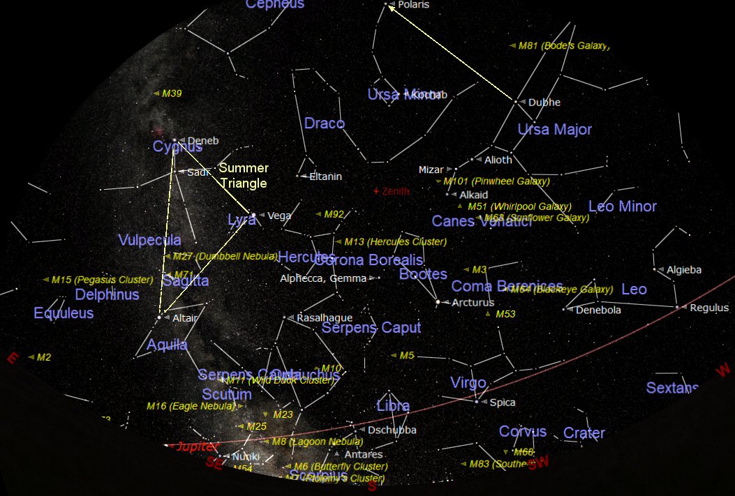 Marked on the chart above is the ‘Summer Triangle' which is the most prominent feature in the summer sky. The term ‘Summer Triangle' was suggested by Sir Patrick Moore and has now become the starting point for exploring the summer night sky. The corners of the imaginary triangle are positioned on the three obvious bright stars: Deneb in the constellation of Cygnus, Vega in Lyra, and Altair in Aquila. The Milky Way (our Galaxy) flows through the Summer Triangle and passes through Aquila and Cygnus.