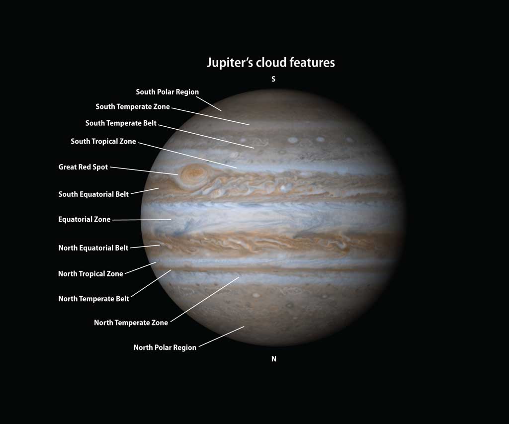 The Belts and Zones are regions of higher and lower atmospheric pressure. The lighter coloured ‘Zones' are regions of rising gas caused by convection of heat from the core of Jupiter. The darker ‘Belts' are regions of falling gas and are approximately 20 kilometres lower in altitude than the Zones. In the regions where the belts and zones meet, huge storms are created as the gas in the belts and zones moves at different speeds and directions. A larger telescope will allow some detail of the storm patterns to be seen.