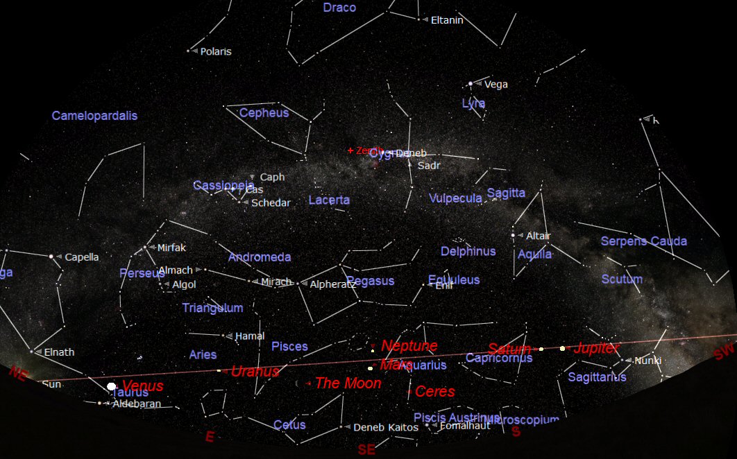 The chart above shows the night sky looking south at about 22:00 BST on 15th June. West is to the right and east to the left. The point in the sky directly overhead is known as the Zenith and is shown in the upper centre of the chart. The curved brown line across the sky at the bottom is the Ecliptic or Zodiac. This is the imaginary line along which the Sun, Moon and planets appear to move across the sky from east to west. The constellations through which the ecliptic passes are known as the constellations of the ‘Zodiac'.