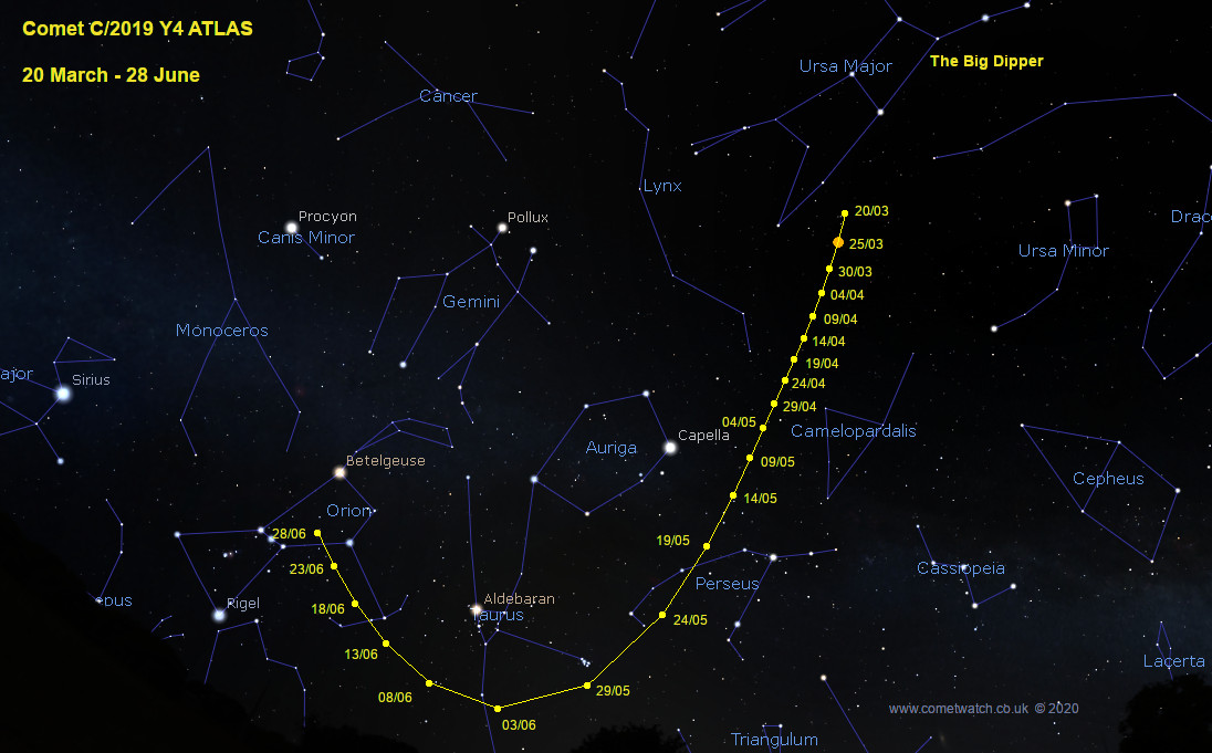Chart showing the path of Comet Atlas from 20th March to 28th June