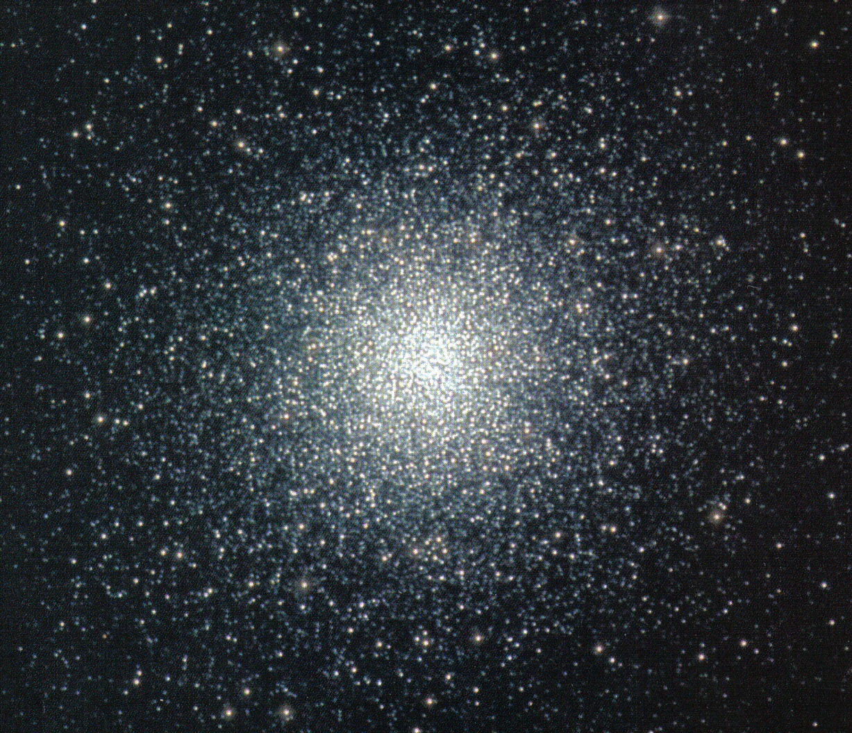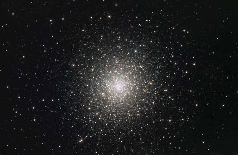 The outer stars of these smaller galaxies have been stripped away, by the gravity of the giant spiral. This process has left the dense cores as clusters of between 100,000 and a million stars. There are about 100 Globular Clusters in a halo around the Milky Way. There is another Globular Cluster in Hercules M92 but it is further away and needs a telescope to see.