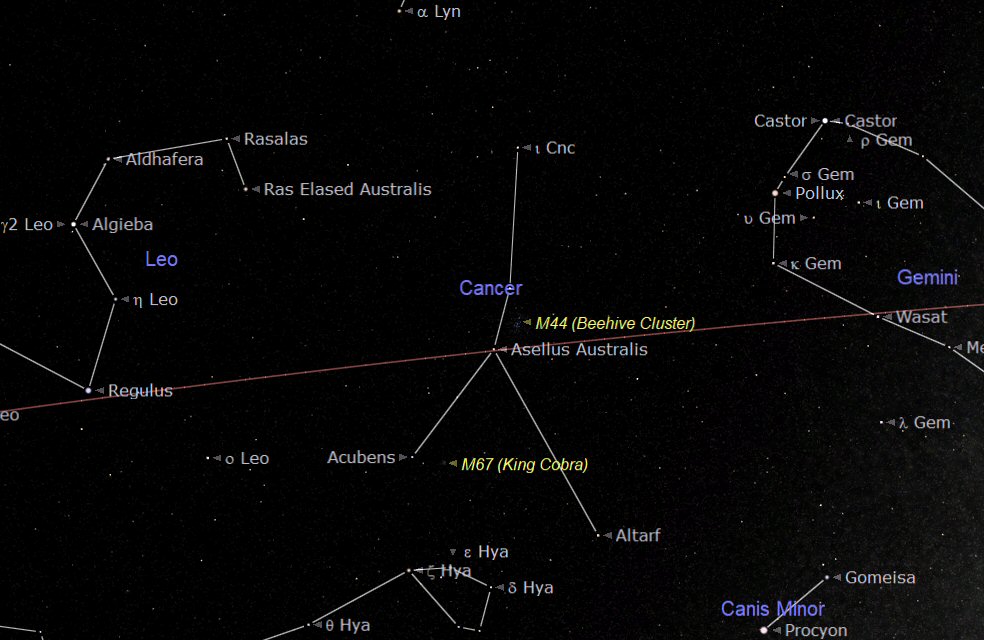 Between the two prominent constellations of Gemini and Leo is the rather indistinct constellation of Cancer (the Crab). The stars of Cancer are quite faint and so the recognisable shape of the constellation can be difficult to identify especially in a light polluted sky. The recognised ‘stick figure' shape of Cancer is an upside down ‘Y' ( ? ).