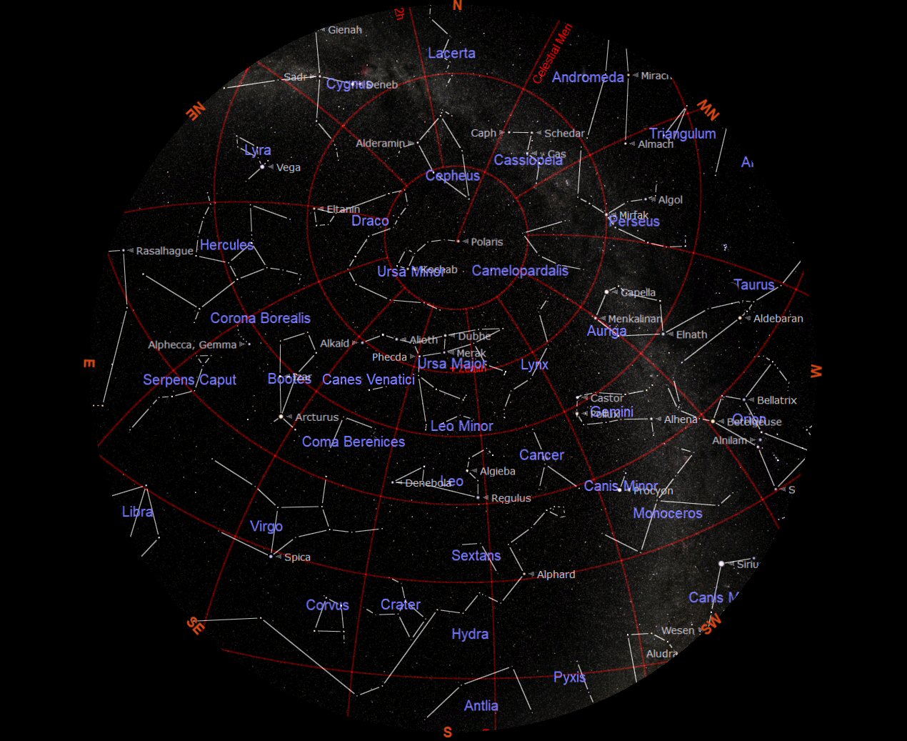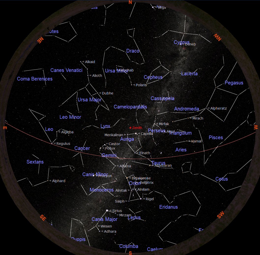 The chart above shows the positions of the constellations as they appeared in the beginning of this year, in the middle of January (15th ). In this chart the whole sky is displayed from the southern horizon to the northern horizon and from the eastern horizon to the western horizon. At the centre of the chart the point directly overhead is marked in red as the ‘ZENITH'. The point on the ground below our Zenith is the town of Newbury (our observing location).