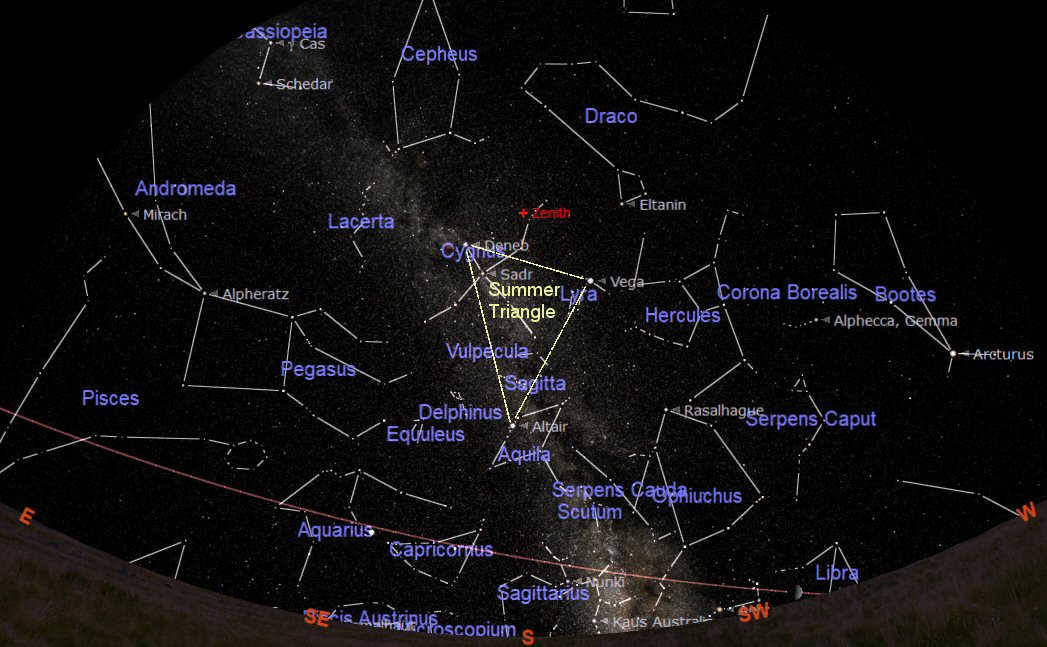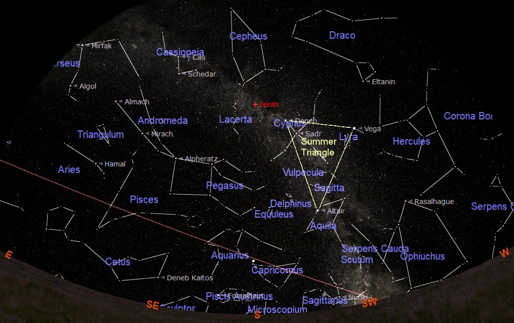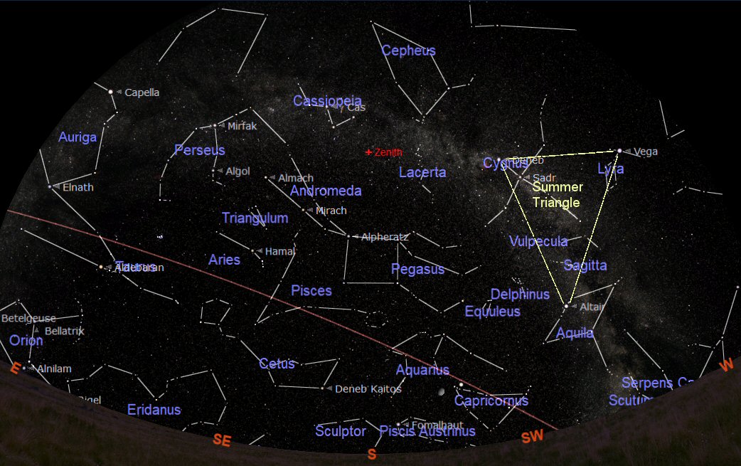 The constellations through which the ecliptic passes during August are Libra (the Scales), Sagittarius (the Goat), Aquarius (the Water Carrier), Pisces (the Fishes) and Aries (the Ram). The Summer Triangle is now prominent in the southern sky.