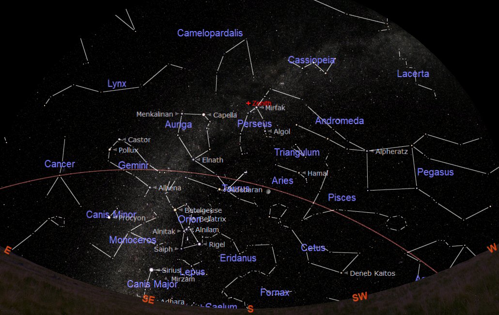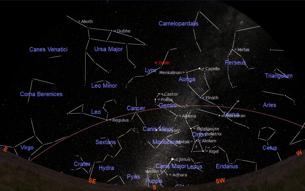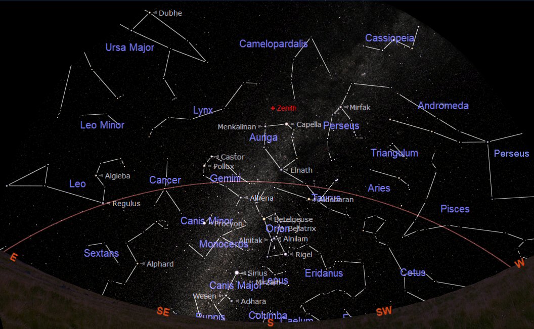 The constellations through which the ecliptic passes during January are Aquarius (the Water Carrier), Pisces (the Fishes), Aries (the Ram), Taurus (the Bull), Gemini (the Twins), Cancer (the Crab) and Leo (the Lion). Orion is dominating the southern sky at this time of the year.
