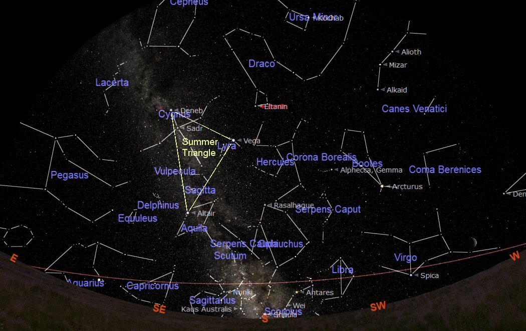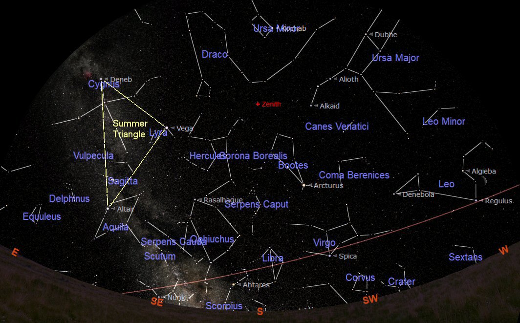 The constellations through which the ecliptic passes during are: Gemini (the Twins), Cancer (the Crab), Leo (the Lion), Virgo (the Virgin), Libra (the Scales) and Sagittarius (the Goat) rising over the South Eastern horizon. The Summer Triangle is now making an appearance in the east and Ecliptic appears very low in the midsummer night sky on 21st June (the Summer Solstice).