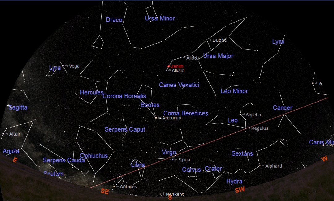 The chart above shows the night sky looking south at about 22:00 BST on 15th April. West is to the right and east to the left. The point in the sky directly overhead is known as the Zenith and is shown (in red) at the upper centre of the chart. The curved brown line across the sky at the bottom is the Ecliptic or Zodiac. This is the imaginary line along which the Sun, Moon and planets appear to move across the sky. The brightest stars often appear to form a group or recognisable pattern; we call these ‘Constellations'.