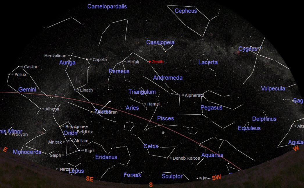 The constellations through which the ecliptic passes during December are Aquarius (the Water Carrier), Pisces (the Fishes), Aries (the Ram), Taurus (the Bull), Gemini (the Twins), Cancer (the Crab) and Leo (the Lion). Orion is now dominating the southern sky and the Ecliptic will be at its highest in the midwinter night sky on 21st December (the Winter Solstice).