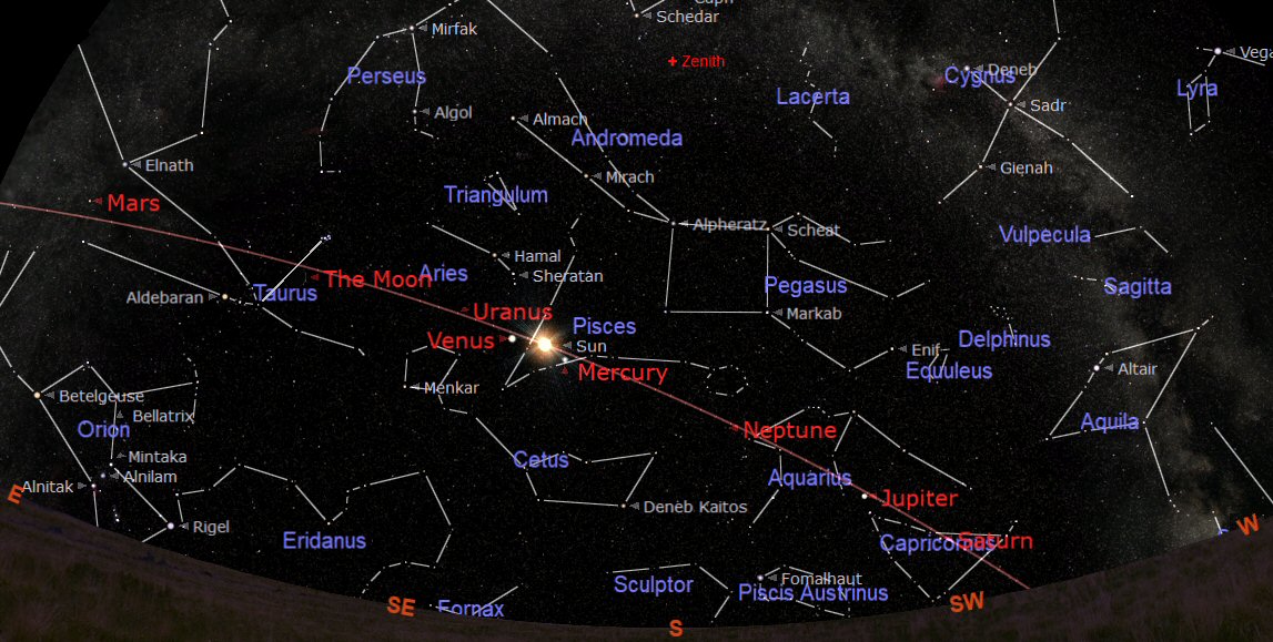 The constellations through which the ecliptic passes during March are Aquarius (the Water Carrier), Pisces (the Fishes), Aries (the Ram), Taurus (the Bull), Gemini (the Twins), Cancer (the Crab), Leo (the Lion) and Virgo (the Virgin). Orion is moving towards the western horizon.