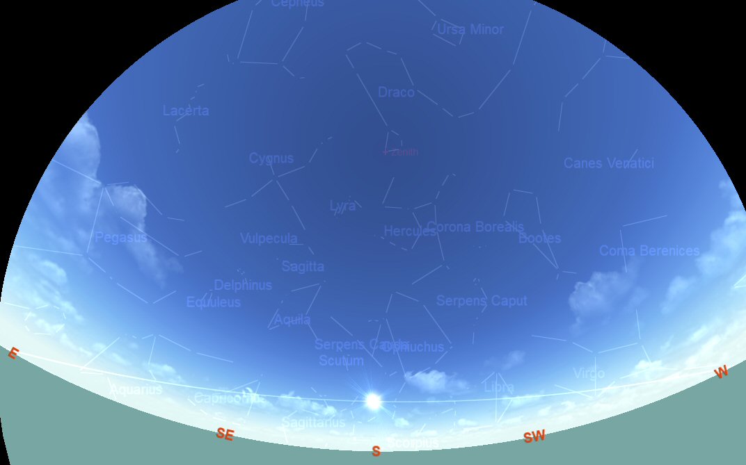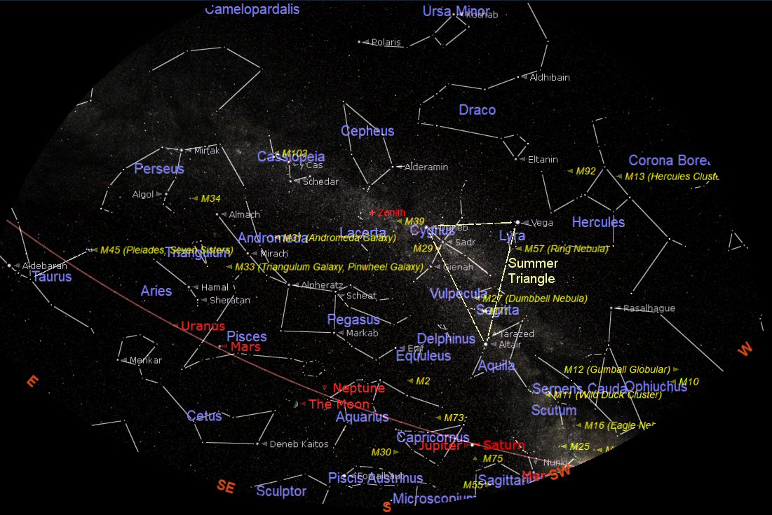 The summer constellations are still prominent in the early night sky. The Summer Triangle with its three corners marked by the bright stars: Deneb in the constellation of Cygnus, Vega in Lyra, and Altair in Aquila. The Summer Triangle is very prominent and can be used as the starting point to find our way around the night sky. The Milky Way (our Galaxy) flows through the Summer Triangle passing through Cygnus, down to the horizon in Sagittarius. The Milky Way flows north from the Summer Triangle through the rather indistinct constellation of Lacerta (the Lizard), past the pentagon shape of Cepheus and on through the ‘W' shape of Cassiopeia (a Queen), Perseus and Auriga (The Charioteer).
