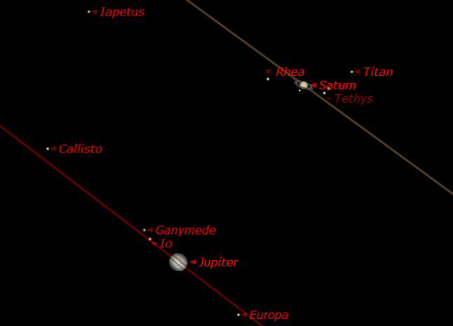 The orbital paths of the planets are show as red for Jupiter and brown for Saturn. It can be seen on the chart above that the orbital paths a getting closer towards the end of the year as the planets move further west.