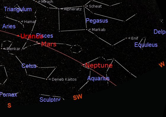 Planets observable: Jupiter, Saturn (very early evening), Neptune, Mars, Uranus (in the evening), Venus and Mercury (in the early morning in the east before sunrise).