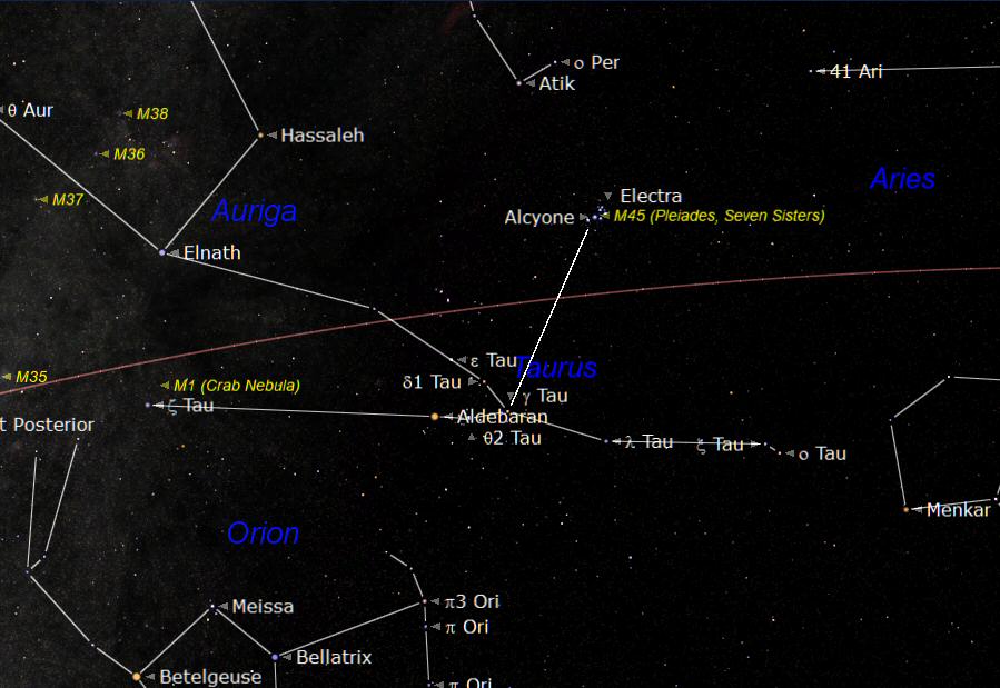 With a little imagination Taurus appears to be charging Orion in the illustration. Taurus sits on the Ecliptic and is one of the star signs of the Zodiac. The asterism (shape) used to identify Taurus resembles a stretched ‘X'.