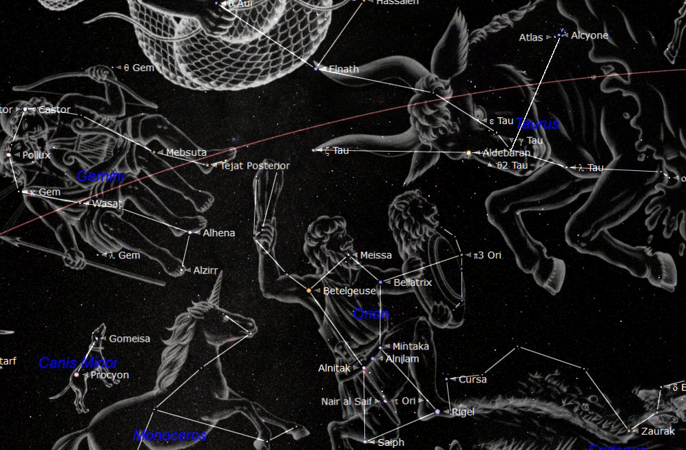 Constellations through which the ecliptic passes this month are Sagittarius (the Archer), Capricornus (the Goat), Aquarius (the Water Carrier), Pisces (the Fishes), Aries (the Ram), Taurus (the Bull), Gemini (the Twins) and Cancer (the Crab, just off the chart to the east).