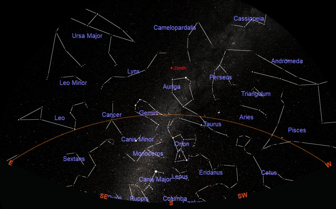 Because the constellation of Gemini is above the horizon from early evening, the meteors can be seen for most of the night and in almost any part of the sky. By midnight the constellation will be almost due south and high in the sky. If you are intending to have a look remember to wrap up warm before you go out because you will soon feel very cold and that will spoil your enjoyment of the shower. Make yourself comfortable in a garden chair and spend at least an hour looking .