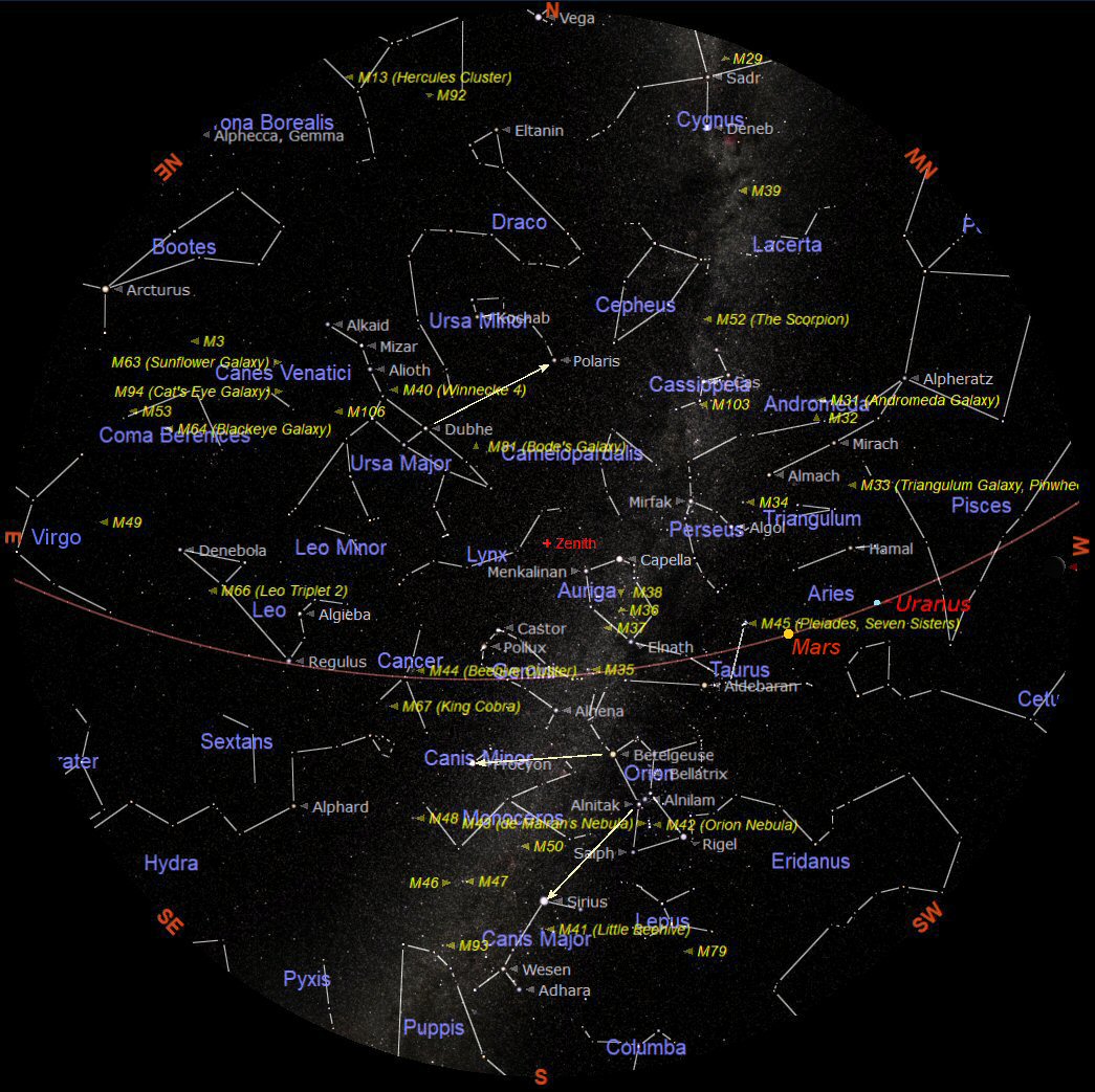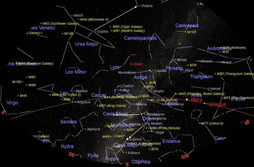 Following Taurus is the constellation of Gemini (the Twins). The two brightest stars in Gemini are Castor and Pollux and they are named after mythological twins. To the north of Taurus is the odd pentagon shape of Auriga (the Charioteer). Dominating Auriga is the brilliant white star Capella which is almost directly overhead. For those with a telescope there is a line of lovely open clusters to search out in Taurus and Auriga. These are M35 in Taurus and M36, M37 and M38 in Auriga.