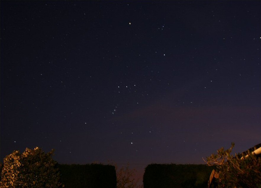 Above and between his shoulders is a little group of stars that mark out the head. From his right shoulder (Bellatrix) he holds out a shield. From his left shoulder (Betelgeuse) a club is held above his head. It almost looks as if Orion is fending off the charge of the great bull Taurus who is located above and to the west (right) of Orion.
