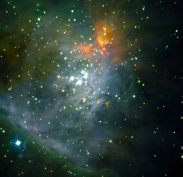 This nebula actually pervades over the whole area of sky around Orion but we can only see this part around M42 because it is illuminated by the young stars forming in it. Most of the energy illuminating this nebula comes from a group of 4 stars known as the Trapezium. These stars have formed out of the gas and dust in the nebula; they are young, hot and very active. The Trapezium can be seen quite easily using a small telescope. The four stars of the trapezium (there is a fifth fainter star) are just the brightest of what is an Open Cluster in the process of forming. The Orion Nebula actually contains many more very young stars that are still hidden by the gas and dust of the nebula.