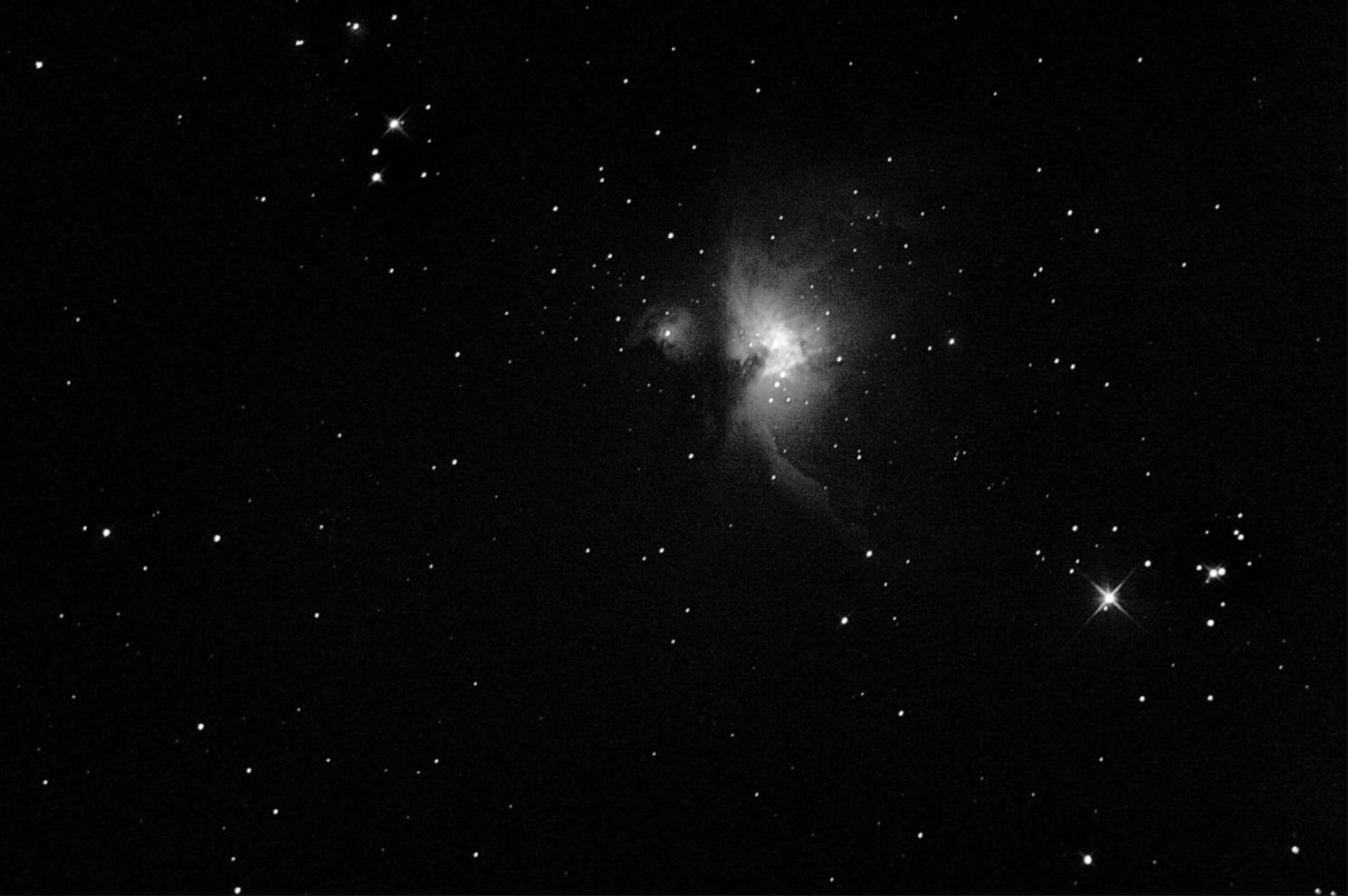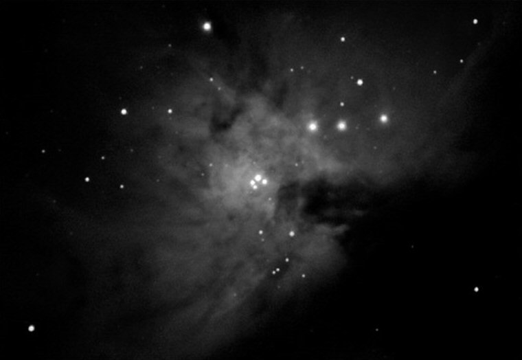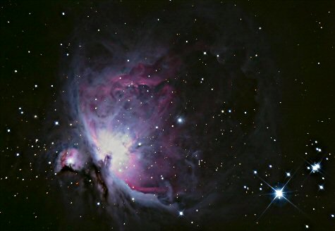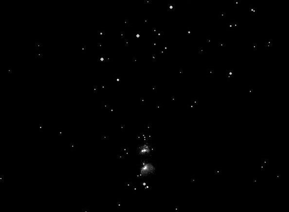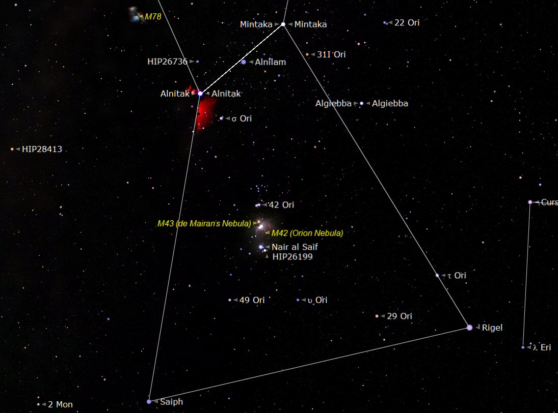 Down from Orion's very distinctive belt there is a line of stars, ending at the star Nair al Saif that looks very much like a sword attached to his belt. Here can be found the main interest in Orion, the Great Nebula known as Messier 42 (M42).