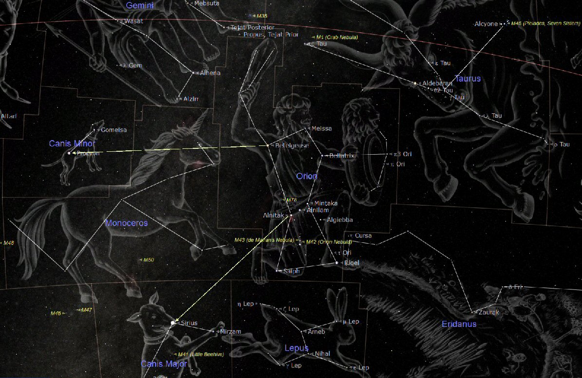 The constellation of Orion and his dogs Sirius and Procyon