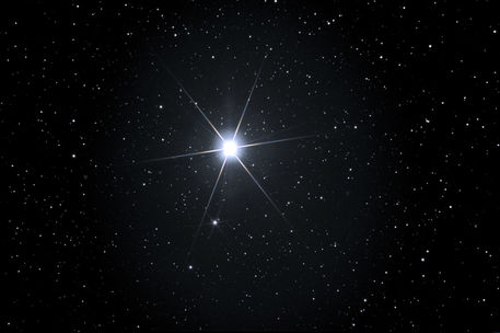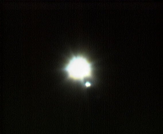 Those who have a telescope should also have a good look at Rigel because it is actually an interesting double star. As the main star is a giant and very bright it is quite difficult to see the fainter companion star. First centralise Rigel using a 10mm eyepiece then carefully remove the 10mm eyepiece and insert a Barlow lens into the focuser. Insert the 10mm eyepiece into the Barlow. Gently turn the focus knob to move the focuser barrel in (towards the telescope) to refocus the image. If Rigel is not visible it may be necessary to use the finder to recentralise the image of Rigel. Adjust the focus until Rigel looks as small as possible (it may be sparkling due to air turbulence and the high magnification). Look carefully and it may be possible to see Rigal's smaller companion somewhere close to the very bright main star. See the image below.