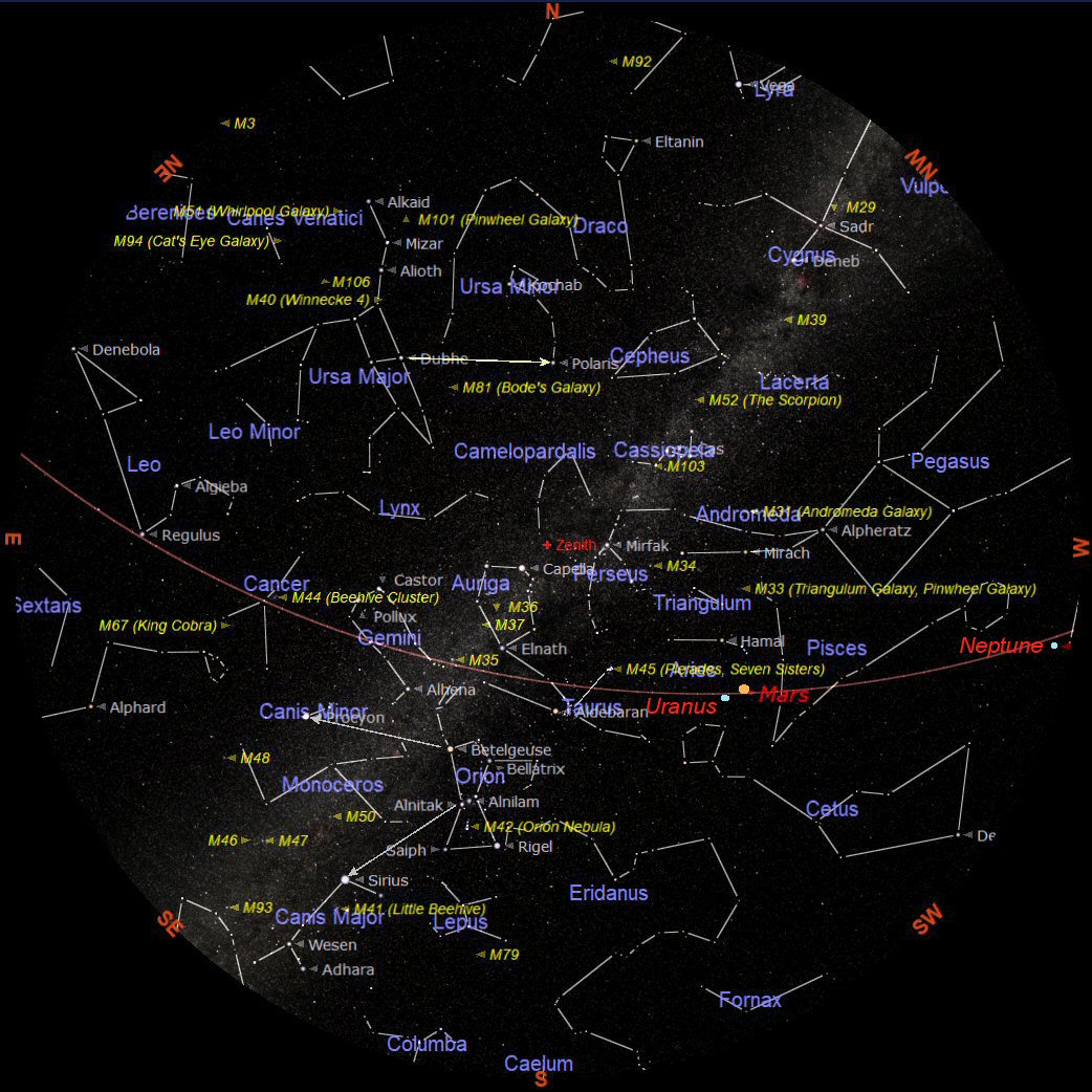 The Milky Way (our Galaxy) flows through the pentagon shape of Cepheus and down through the ‘W' shape of Cassiopeia then on through Auriga and Orion to the south eastern horizon.
