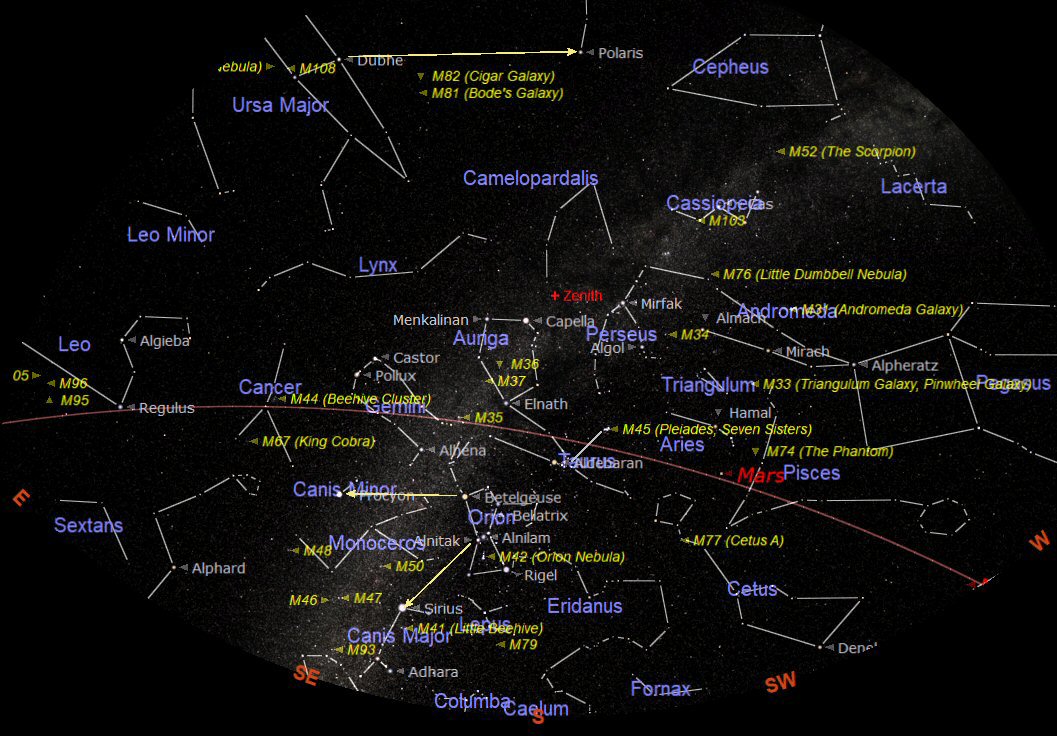Close to the south western horizon is the constellation of Pisces (the Fishes). Pisces a little faint and indistinct but it is easy to find this month because the bright and orange coloured planet Mars is located within its boundaries.