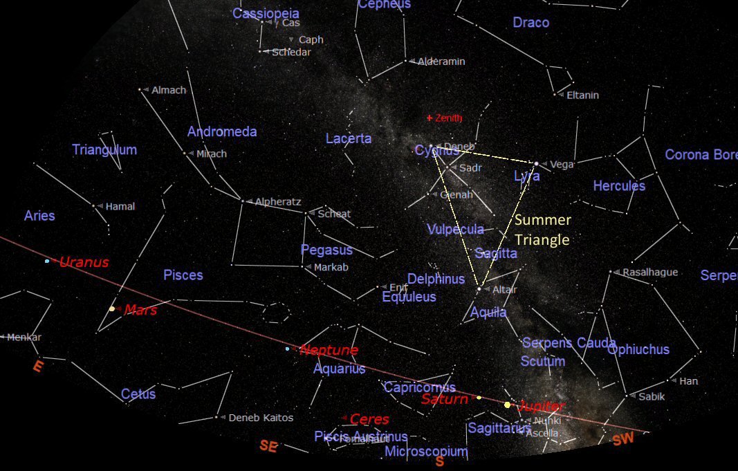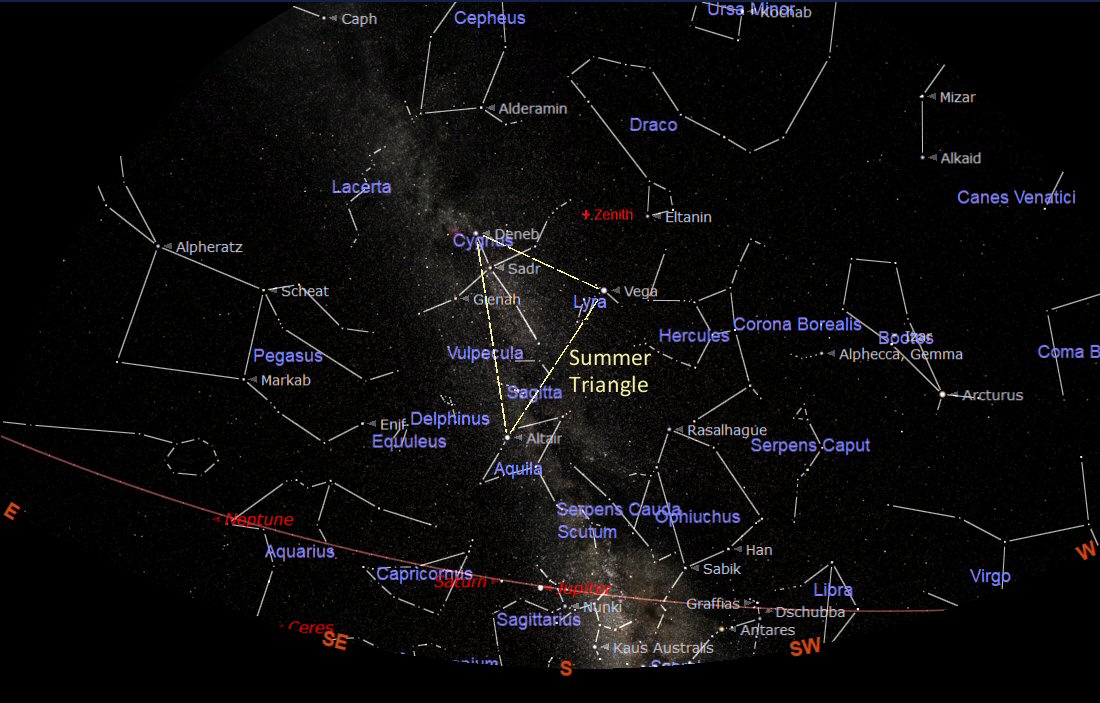 The summer constellations are still prominent in the night sky lead by Hercules (the Hunter). Following Hercules is the Summer Triangle with its three corners marked by the bright stars: Deneb in the constellation of Cygnus, Vega in Lyra, and Altair in Aquila. The Summer Triangle is very prominent and can be used as the starting point to find our way around the night sky. The Milky Way (our Galaxy) flows through the Summer Triangle passing through Cygnus, down to the horizon in Sagittarius.