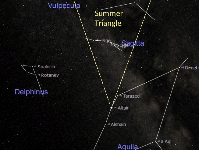 Just to the east (left) of the lower part of the Summer Triangle is the lovely little constellation of Delphinus (the Dolphin). It is small but can be seen easily with the unaided eye from a dark area when the sky is a clear.