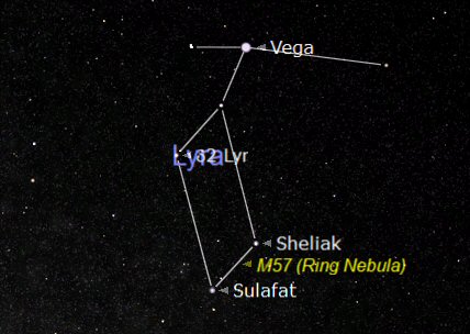 To the south east of the very bright star Vega is the lozenge shaped asterism comprised of four stars . Between the two lower stars: Sulafat and Sheliak is the Messier object M57. This is a ‘Planetary Nebula' which has nothing to do with a planet. It is in fact a dying star that was similar to our Sun but older. The star had used most of its Hydrogen fuel and expanded to form into a Red Giant. After passing though that red giant phase it gently collapsed to become a White Dwarf. The very thin outer mantle of the red giant drifted away into space as the star collapsed. The white dwarf is now surrounded by a bubble of gas and dust. It looks like a small ‘smoke ring' when seen through a telescope but can't be seen using normal binoculars.