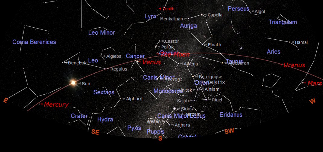 The mid month morning sky at 09:00 showing the positions Mercury and Venus