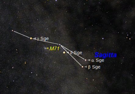 The real beauty of Sagitta is how it looks using binoculars but it does host one messier object this is M71 also known as NGC 6838. This is a rather nice but small and faint Dwarf G lobular C luster that does need a medium sized telescope to see well.
