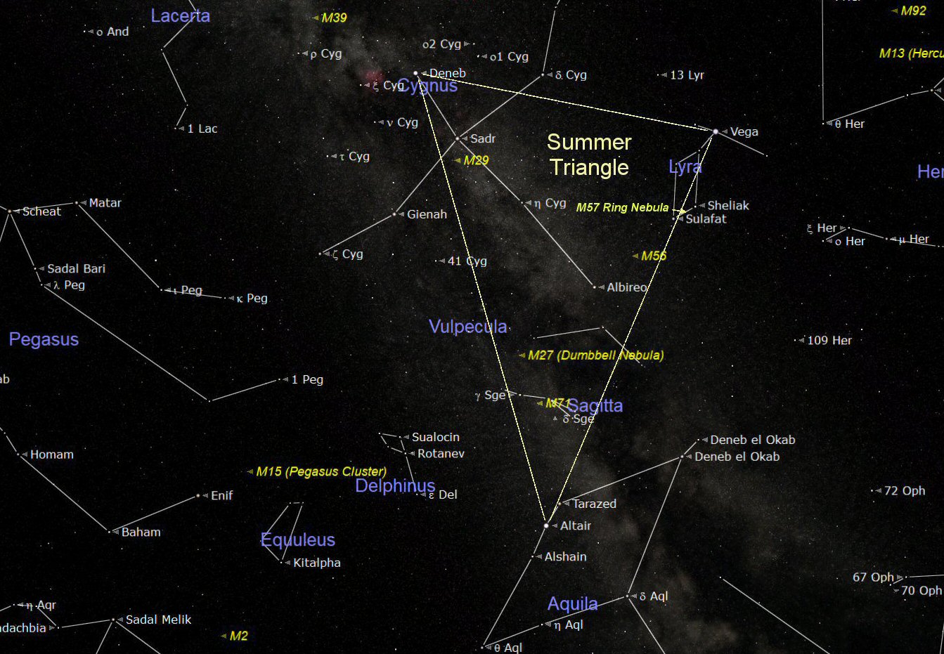 The chart above shows the sky around the Summer Triangle. The term ‘Summer Triangle' was suggested by Sir Patrick Moore and has now become the best known feature of the summer night sky. The corners of the imaginary triangle are positioned on the three obvious bright stars: Deneb in the constellation of Cygnus, Vega in Lyra, and Altair in Aquila. The Milky Way (our Galaxy) flows through the Summer Triangle and passes through Aquila and Cygnus.