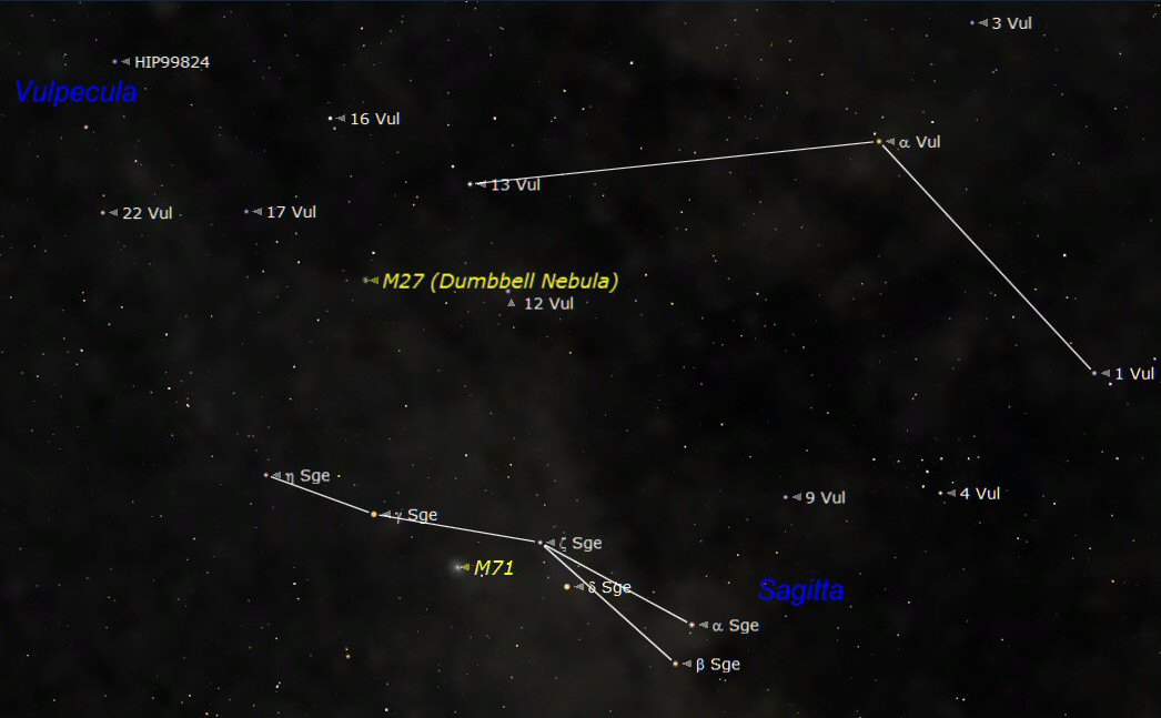 Sagitta is good fun to find using binoculars because it really does look like an ‘arrow'. It is composed of three stars that look like the shaft of the arrow and two stars that resemble the flight feathers.