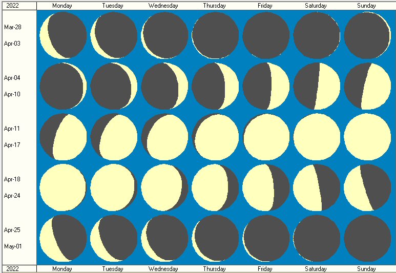 The Sun rises at about 06:30 at the beginning of the month and 05:40 by the end of the month. It sets at 19:45 at the beginning of the month and 20:15 at the end of the month. The Sun was half way to midsummer on 20th March when it was the spring (Vernal) equinox. On this date the day and night were of equal length at exactly 12 hours long.
