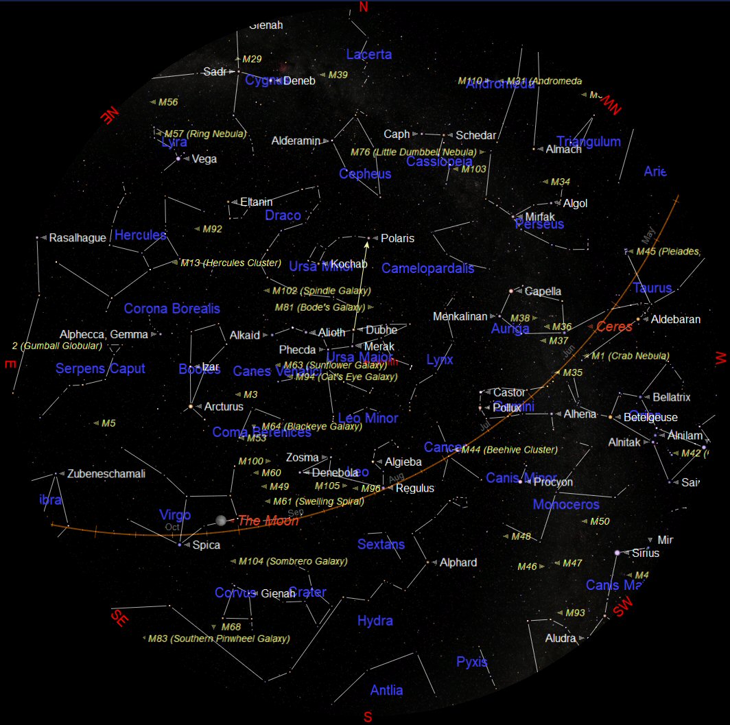Constellations through which the ecliptic passes this month are: Pisces (the Fishes) just off the right of the chart, Aries (the Ram), Taurus (the Bull), Gemini (the Twins), Cancer (the Crab), Leo (the Lion), Virgo (the Virgin) and Libra (the Scales) just coming into view.