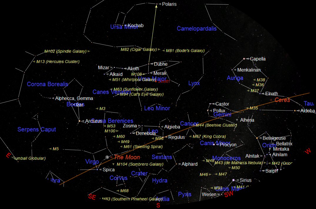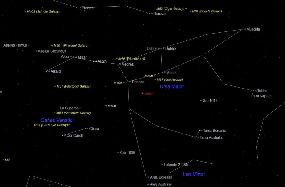 Ursa Major is directly overhead at this time of the year as can be seen on the chart above. The point in the sky directly overhead of the observer is called the ‘ZENITH' and is shown in red on the chart above. The chart shows the sky as it will appear at 21:00 on 15th April.