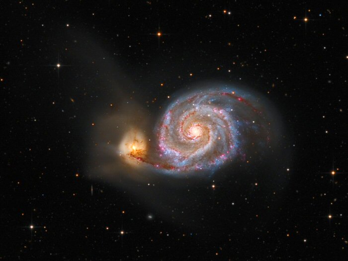 M51, also known as the Whirlpool Galaxy, is a beautiful 'face on' Spiral Galaxy located in the constellation of Canes Venatici just below Ursa Major. M51 is one of the most famous galaxies in the sky, appearing face-on when viewed from Earth. At a magnitude of +8.4, it is relatively bright and visible in binoculars, especially from dark sites. M51 has a much smaller dwarf companion known as NGC 5195 and together they form the finest and most studied example of an interacting (colliding) galaxy pair in the sky.