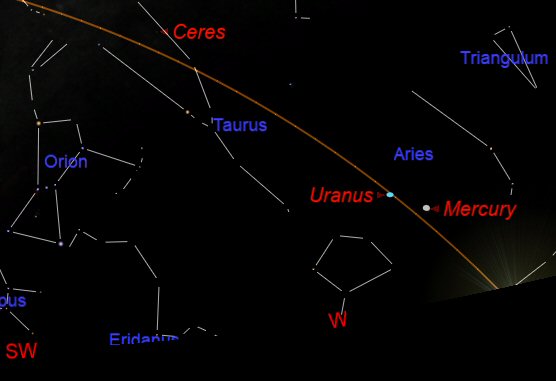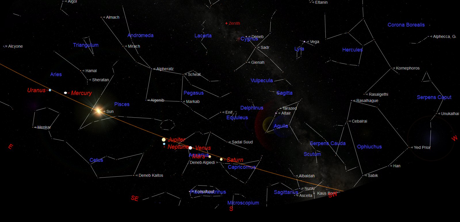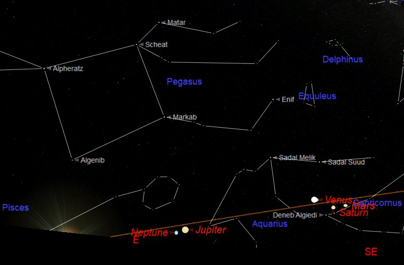 The chart above shows the location of the planets along the Ecliptic after sunrise in the east. The sky has been darkened to make the planets visible. The planets are: Mercury, Venus, Mars, Jupiter, Saturn and Neptune. They are visible along the Elliptic from the West (right) to East (left). The planets appear low in the bright morning sky before sunrise and are not well positioned for observing.
